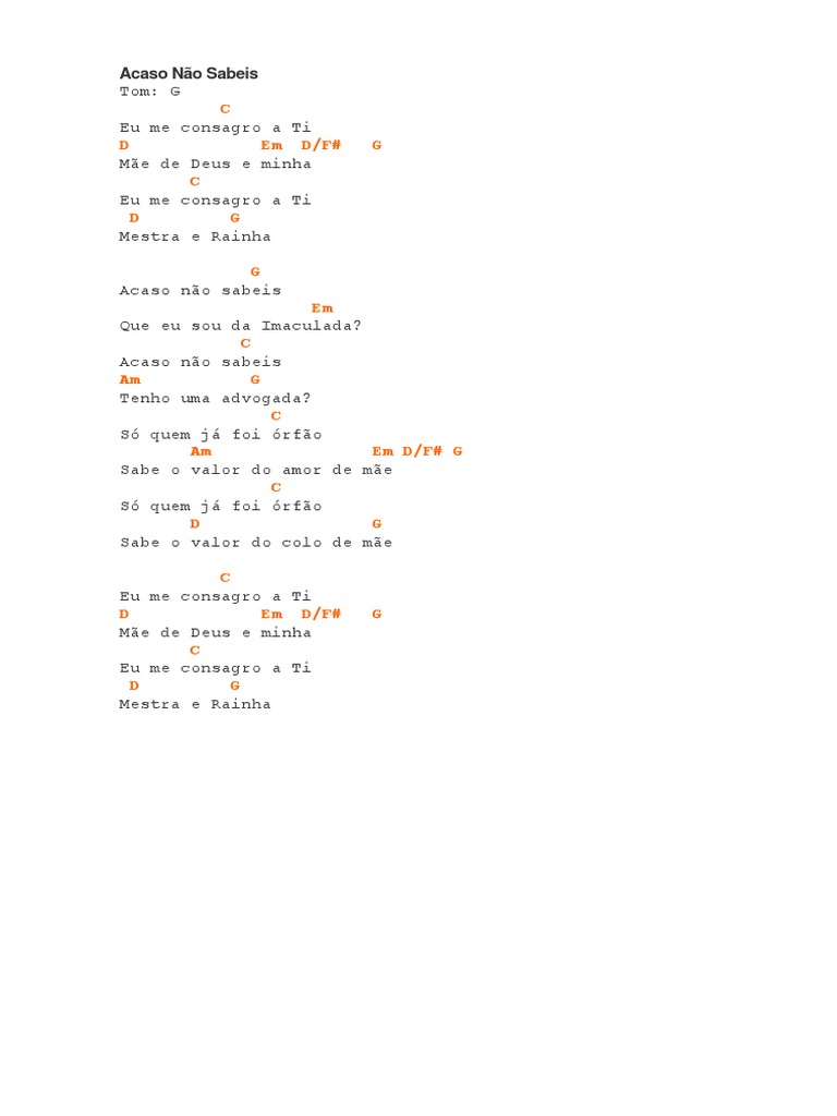 Só quem já foi órfão Sabe o valor do amor de. G Intro C D Em G C Eu me consagro a Ti D Em D G Mãe de Deus e minha C Eu me consagro a Ti D G Mestra e rainha G Acaso não sabeis Em Que eu sou da ImaculadaC Acaso não sabeis Am G Tenho uma advogadaC Só quem já foi órfão D Em D G Sabe o valor de amor de mãe C Só quem já foi órfão D G Sabe o valor do colo de mãe C Eu me consagro a Ti D Em D G Mãe de Deus e minha C Eu me.