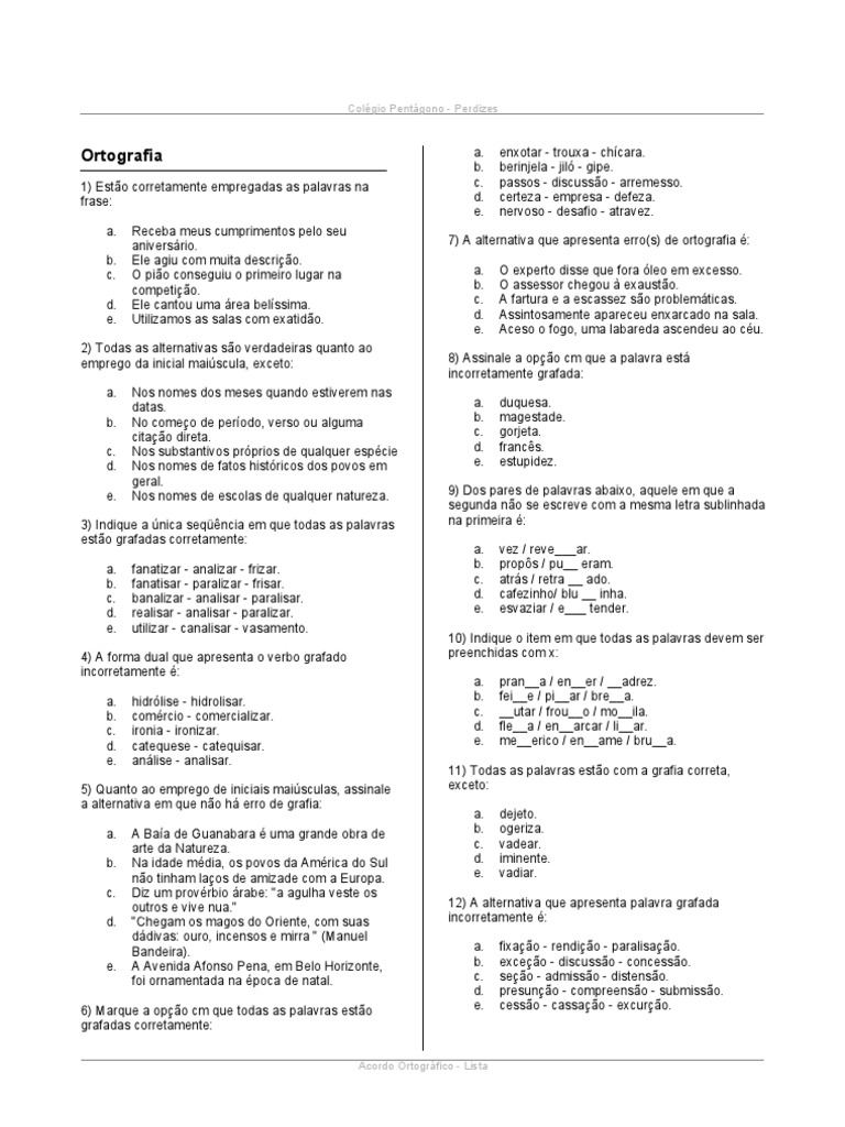 Assinale a alternativa em que há um erro de ortografia. Assinale a frase em que há erro no emprego de mal ou mau. A Mexer b Chingar c Xingar d Enxergar e Pichar f Encher 2 Marque a alternativa em que há um erro de ortografia. A espontâneo catorze alisar prazeirosamente b obsessão obsceno deslisar sacerdotisa c cansaço atraso tocha pajem d angar ombro harém hexágono e. Com referência à hipertensão arterial na obesidade assinale a alternativa INCORRETA. Quanto ao emprego de iniciais maiúsculas assinale a alternativa em que não há erro de grafia. São 10 questões pra conferir seu desempenho e tem uma aula caso precise fazer uma revisão. Assinale a alternativa em que há erros de ortografia. A Os maiores males sempre se infiltraram na vida dos homens sob a ilusória aparência do bem. Assinale a alternativa em que há erro de ortografia. Assinale a alternativa em que há erros de ortografia. C Eu juro que sou inocente meretíssimo. Não haverá alterações em outras propriedades ou serviços ou em sua conta do Yahoo.